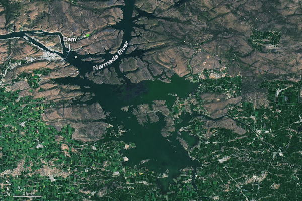 A bemutatott képpáron egy indiai létesítmény építése követhető, a két felvétel készítése között eltelt két év alatt kiépült az energiatermelő rendszer a közép-indiai Narmada folyó gátja mögött kialakított mesterséges tavon. Az 1315 km hosszú Narmada (vagy Nerbudda) India azon kevés folyóinak egyike, amelyik keletről nyugatra tart, így az Arab-öbölbe ömlik. A képeken látható Omkareshwar gát 2003 és 2007 között épült. A gát mögött létrejött mesterséges tó vízfelszíne meghaladja a 90 km2-t, a 987 millió köbméter víztérfogatú tó vizével 132 500 hektár mezőgazdasági területen biztosítható az öntözés. A gát vízerőművének beépített kapacitása 520 MW.