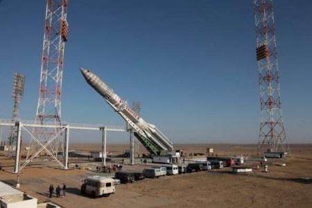 A Proton-M rakéta, tetején a ViaSat-1 műholddal az indítás előtt, a bajkonuri 39. számú starthelyre való felemelés közben. (Kép: Roszkoszmosz / Hrunyicsev)