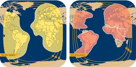 A SES-4 (korábbi jelzéssel NSS-14) C- és Ku-sávú lefedettsége. (Kép: SES World Skies)