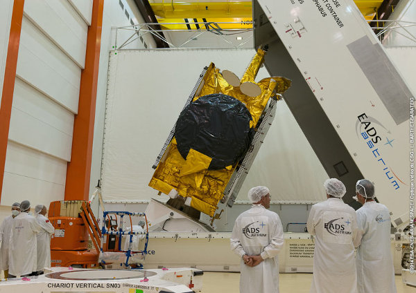 A képen látható Measat-3b már áprilisban megérkezett Francia Guyanába, de be kellett várnia késve elkészült társát. Az Optus-10-et ugyanis vissza kellett szállítani gyártása helyére, Kaliforniába, technikai problémák miatt. (Kép: ESA / CNES / Arianespace / Optique Video du CSG - L. Barhet Barateig)