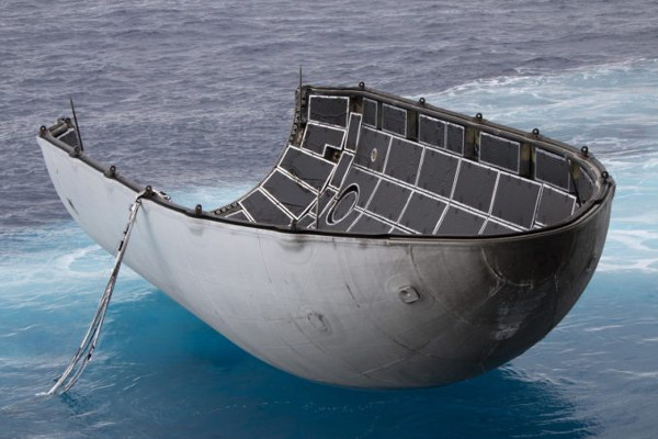 A Falcon-9 orrkúpjának egyik fele a Csendes-óceán vizén úszva, egy előző start után, május 22-én. (Kép: SpaceX)