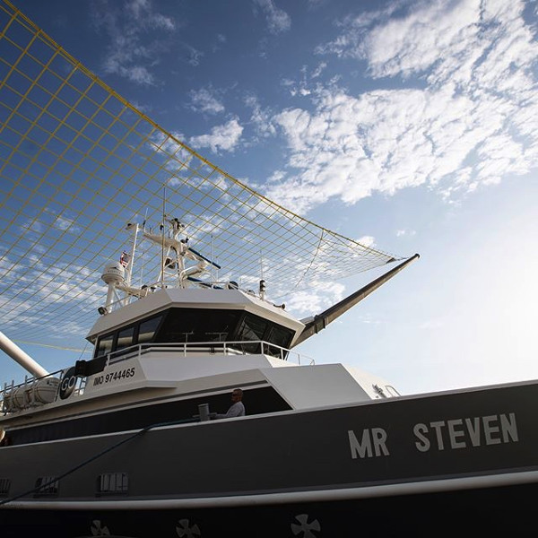 A SpaceX hajója, a Mr. Steven még a Los Angeles kikötőjéből való kifutása előtt, rajta az új, a korábbinál négyszer nagyobb felületű hálóval. (Kép: SpaceX)