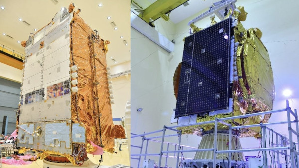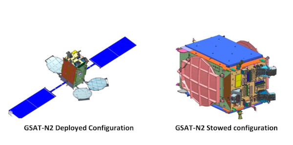 A GSAT-20 összecsomagolva (jobbra), illetve és kinyitott antennákkal és napelemtáblákkal (balra). (Kép: NSIL)