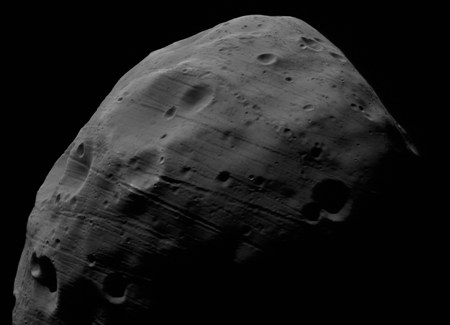 A Mars különleges, 27 km × 22 km × 19 km-es méretű holdja a Naprendszer legsötétebb (a legkisebb fényvisszaverő képességgel rendelkező) objektumai közé tartozik. A Mars körül keringő európai űrszonda most 93 km-re közelítette meg, miközben 3 km/s relatív sebességgel haladt el mellette. Az ügyes manőverezésnek köszönhetően magát a szondát az elhaladással ellentétes irányban forgatták, így a fényképezéshez hosszabb expozíciós időt tudtak használni.