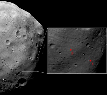 A Fobosz-Grunt potenciális leszállóhelyei a Phoboson, a Mars Express HRSC 4,4 m-es felbontású, 2010. március 7-én készített felvételén. (Képek: ESA / DLR / FU Berlin / G. Neukum)