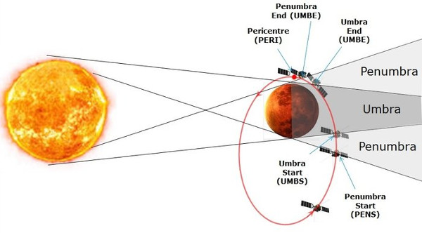 A Mars Express pályájának félárnyékos (penumbra) és árnyékos (umbra) szakaszai, amikor a napelemek a névlegesnél kisebb (vagy 0) teljesítménnyel termelnek áramot. A napsütés és az árnyék váltakozása jelentős termikus terhelést is okoz, amit a versenyzőknek a számítások során figyelembe kellett venniük. (Kép: ESA)