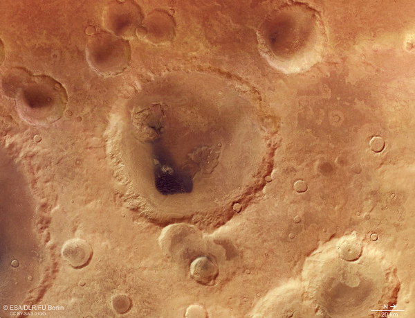 A 102 kilométer átmérőjű Neukum-kráter belsejében két sekélyebb mélyedés és dűnemező található. A képet a Mars Express HRSC kamerájával 2005. december 31-én, 2007. május 24-én és 2007. május 27-én készített felvételeiből állították össze. A képen észak jobbra van. (Kép: ESA / DLR / FU Berlin, CC BY-SA 3.0 IGO)