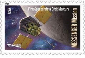 A másik bélyegen is szerepel a Mercury felirat, ezúttal a Merkúr, a Naprendszer legbelső bolygója angol neveként. Hat és fél éves repülés után idén állt ugyanis pályára a bolygó körül a NASA MESSENGER űrszondája. A sikeres lefékezés után a szonda megkezdte a bolygó felszínének és környezetének tanulmányozását.