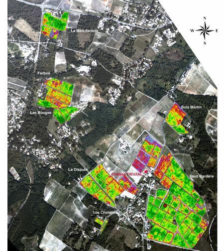 A Fieuzal-szőlőbirtok ültetvényei műholdképen. A színkódolásban a piros és a lila jelzi a szőlő megfelelő érettségét, lehetőséget adva a „precíziós szüretelésre”. (Kép: Oenoview)