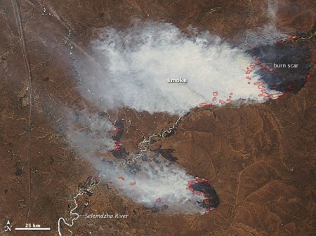 Az idei év sem kivétel, ahogyan azt a NASA Aqua távérzékelő műholdján repülő MODIS (Moderate Resolution Imaging Spectroradiometer) műszer felvételei – köztük az alábbi – is tanúsítják. Az április 29-én készített képen a mezőgazdasági területek és füves mezők barnás színűek. Az aktívan égő tüzeket a műhold detektálni képes, ezeket piros körvonalakkal rajzolták a képre. Innen indulnak ki a hatalmas, az űrfelvételt is kitöltő füstfelhők. Egyes sötét foltokban már befejeződött a tarlóégetés. A képet átlós irányban a Szelemdzsa folyó kanyargó szalagja szeli át.