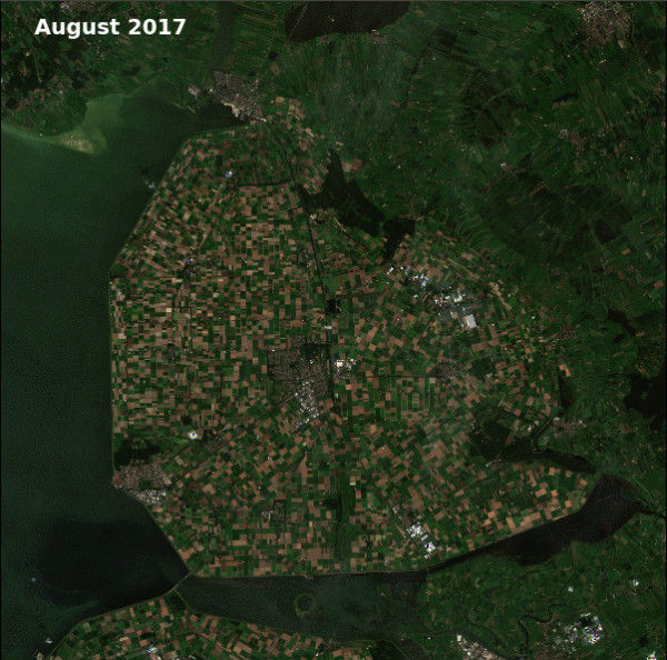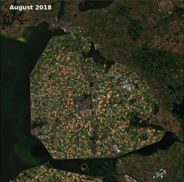 A nyári tartós hőség és a kevés csapadék érzékenyen érintette az élelmiszertermelő ágazatot, például a burgonyatermesztést. A képek Hollandia Emmeloord (Flevoland tartomány Noordoostpolder területe) régiójáról 2017 augusztusában és 2018 augusztusában készített műholdfelvételeket hasonlítják össze. A 2017-es kép összességében zöldebb, a 2018-as barnább árnyalatú, ami az aszály hatásának tudható be. (Kép: Copernicus Sentinel adatok 2018 / feldolgozás: ESA / GeoVille)