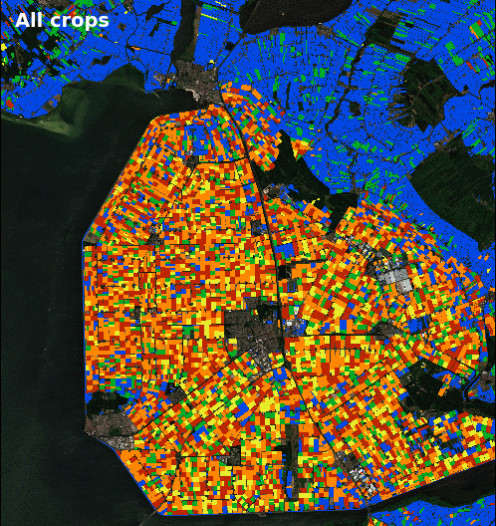 Ugyanezen terület nyár eleji (2018. június) növényklasszifikációja a Sentinel–2 műholdak adatai alapján. A színek közül a zöld a nyári betakarítású élelmiszernövényeket jelöli, piros a burgonya, narancsszínű a zöldségek és virágok, sárga a gabonafélék, a kék pedig a fűnek felel meg. (Animált kép: Copernicus Sentinel adatok 2018 / feldolgozás: ESA / GeoVille)