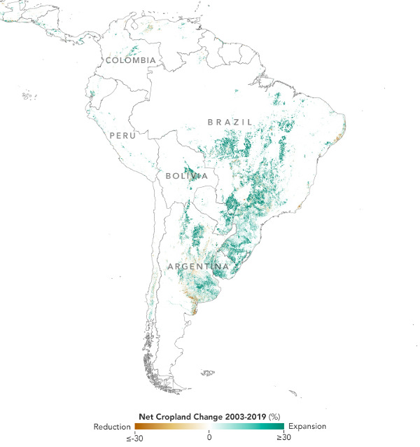 A mezőgazdasági területek nettó növekedése Dél-Amerikában 2003–2019 között. (Kép: NASA Earth Observatory, Lauren Dauphin; adatok: Potapov et al. 2022)