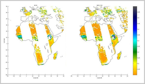 A bal oldali képet az SMOS műhold fényességi hőmérséklet mérései alapján állították elő. Az adatok a mérés után három órán belül elérhetők, a feldolgozás pedig az új, neurális hálózattal egyetlen másodpercig sem tart. A hagyományos eljárással előállított jobb oldali kép több óra alatt készült el. A kétféleképpen kapott eredmény minősége azonos, bár a térbeli lefedettség a gyors számítási eljárásnál valamivel gyengébb, mert ott a sávok szélére eső adatokat nem használták fel (Kép: CESBIO)