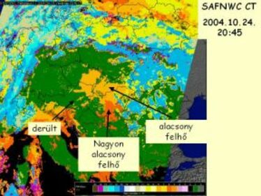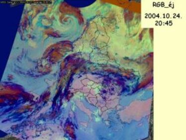 A következő ábrán az MSG műhold 2004. 10. 24-én 20:45 UTC-kor készült felvételét láthatjuk. Ez egy saját fejlesztésű kompozit kép, három kalibrált és kontrasztosított infravörös sáv kombinációját jelenítjük meg a három alapszínben. Barnás színben a vastag magas felhők, sötétkékben a magas szintű vékony felhők jelennek meg, sárgásbarnák a középszintű felhők, sárgászöldek az alacsony felhők és a ködös területek, rózsaszínű a derült szárazföld, világoskék a derült tenger.