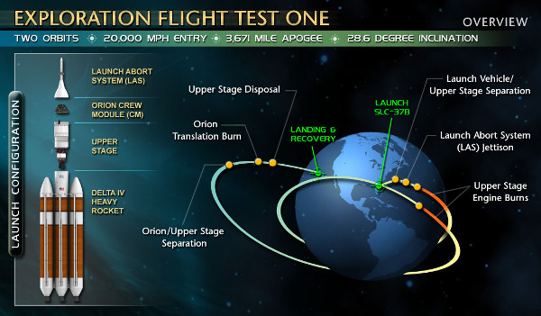 A starthoz egy Delta-4 Heavy hordozórakétát vesznek igénybe, amely a floridai Cape Canaveral 37B indítóállásáról emelkedik a magasba, várhatóan december 4-én, magyar idő szerint 13:05-kor. Az EFT-1 (Exploration Flight Test-1) jelzésű repülés alkalmával az Orion tesztpéldánya 5800 km magasságba jut el, ami mintegy 15-ször nagyobb a Nemzetközi Űrállomás pályamagasságánál. Az űrjármű két Föld körüli keringést követően vissza is tér. A légköri belépés sebessége (kb. 32 ezer km/h) megközelíti azt az értéket, amire egy Holdról való visszaúton kell számolni. A kísérlet fő célja az Orion különféle fedélzeti rendszereinek és a visszatéréskor a hővédő pajzsnak a tesztelése „éles” repülési körülmények között. A visszatérő kabin külső hőmérséklete elérheti a 2200 °C-ot is. Az Orion végül Észak-Amerika nyugati partjai közelében, a Csendes-óceán vizére ejtőernyőzik le, ahol a haditengerészet hajója várja.