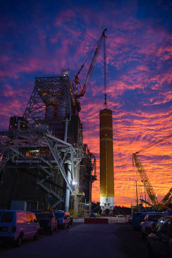 Az SLS első fokozatát januárban állították fel a Stennis Űrközpont B-2 jelű tesztállásába. (Kép: NASA / SSC)