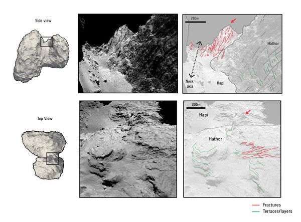 A kutatók az ESA szondáján dolgozó OSIRIS (Optical, Spectroscopic, and Infrared Remote Imaging System) kamera nagy felbontású felvételeinek háromdimenziós elemzését elvégezve olyan vetődéseket és töréseket találtak, amelyek 500 méter mélységig hatolnak az égitest anyagába, hosszuk pedig több száz méter. Az alakzatokat nyírófeszültség hozta létre, vagyis ugyanaz a hatás, amelyik a Földön az egymás mellett elcsúszó kéreglemezeknél földrengést vált ki, de a gleccserek folyásánál is fellép. A felismerés sokat elárul arról, miként változott az idő múlásával az üstökös alakja és belső szerkezete. A kutatók által kidolgozott modell szerint a nyírófeszültség az üstökösmag „nyakánál” maximális, vagyis ott, ahol a két lebeny érintkezik egymással. Az eredményeket ismertető szakcikk a Nature Geoscience folyóiratban jelent meg.