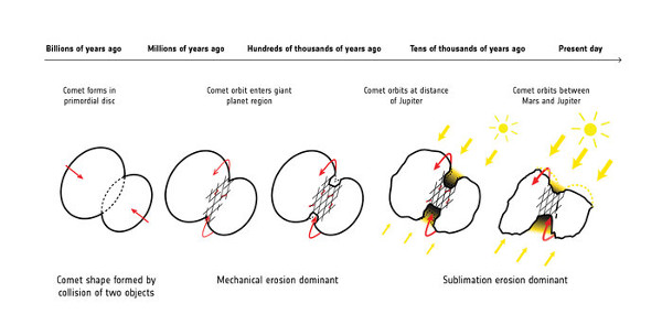A Csurjumov–Geraszimenko-üstökös magja alakjának változása 4,5 milliárd éves története során. A mag két test kis relatív sebességű ütközése eredményeképpen jött létre. Története nagyobb részében a Naprendszer hideg zónájában keringett, ahol a szabálytalan test forgása következtében nyíróerők léptek fel, az így kialakuló mechanikai erózió alakította a felszínét. Miután az üstökösmag bekerült a Naprendszer belső térségébe, a szublimáció következtében fellépő erózió vált dominánssá. (Kép: C. Matonti et al. 2019)