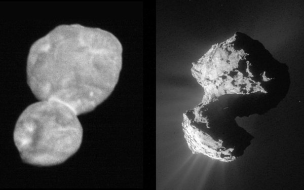 Meglepő a hasonlóság az Ultima Thule (balra) és a Csurjumov–Geraszimenko-üstökös magjának (jobbra) alakja között. Az Ultima Thule körülbelül 34 km hosszú, két lebenye 19,5 km, illetve 14,2 km átmérőjű. A Csurjumov–Geraszimenko-üstökös magja sokkal kisebb, a két lebeny csak 4,1 x 3,3 x 1,8 km and 2,6 x 2,3 x 1,8 km kiterjedésű. (Kép: balra: NASA / Johns Hopkins University Applied Physics Laboratory / Southwest Research Institute; jobbra: ESA / Rosetta / NAVCAM – CC BY-SA IGO 3.0)