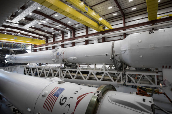 A műhold és a még vízszintes pozícióban levő hordozórakéta a startállás közelében levő hangárban. Míg az első fokozat újrahasznosított, a második fokozat és a műholdat védő orrkúp vadonatúj gyártmány. (Kép: SpaceX)