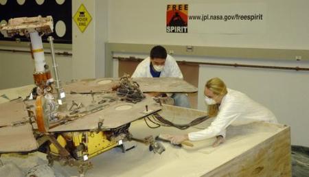 A Spirit kiszabadítása érdekében végzendő manőverek előzetes tesztelésére a laboratóriumban megépítették a terep pontos mását. (Képek: NASA / JPL-Caltech)