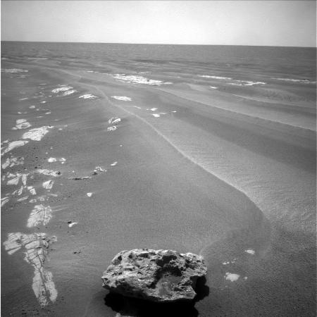 A feltételezett meteorit egy furcsa alakú, a környezeténél sötétebb, feltűnő kődarab. A földi szakemberek július 18-án fedezték fel az Opportunity marsjármű felvételein. A kő a haladási iránnyal ellentétes oldalon bukkant fel, ezért kb. 250 m-t visszafelé kellett megtennie az Opprtunitynek, hogy közelebbről is megvizsgálja. Az elmúlt hétvégén az alfarészecske- és röntgenspektrométer (Alpha Particle X-ray Spectrometer, APXS) segítségével próbálták kideríteni pontos összetételét. A mérések alapján most már valóban úgy tűnik, hogy egy meteoritról van szó. Összetétele hasonlít az ugyancsak a marsjáró által 2005 januárjában talált darabéhoz - az a meteorit volt az első, amelyet egy másik bolygón vizsgálhattak. Az Opportunity most egy időre „letáborozik” a helyszínen, hogy más műszereivel is megvizsgálhassák a leletet.