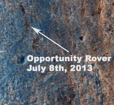 A Mars körül keringő amerikai űrszonda, a Mars Reconnaissance Orbiter (MRO) nagyfelbontású kamerájával (High Resolution Imaging Science Experiment, HiRISE) július 8-án figyelték meg az Endeavour-kráter környékét, ahol jelenleg az Opportunity tartózkodik. A marsjáró ekkor épp tíz éve indult a szomszéd bolygó felé Floridából.