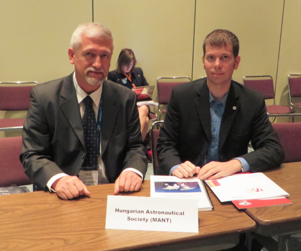 A Magyar Asztronautikai Társaság képviselői az IAF közgyűlésén (balra Solymosi János MANT-elnök, mellette Bacsárdi László MANT-főtitkár).