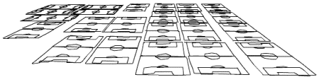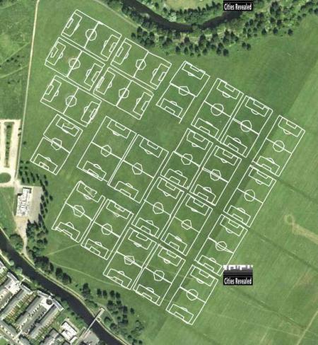 Mindegyik focipályát kb. 12 perc alatt lehet végigsétálni megszakítás nélkül, a fehér vonalazások mentén. A vonalak teljes hossza 18,6 km. A helyszín: Hackney Marsh, London, Nagy-Britannia. Fent a GPS vevőből kiolvasott „rajz”, lent ugyanez egy légifényképre helyezve. (Képek: Jeremy Wood, gpsdrawing.com)