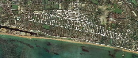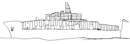 A karikatúrára emlékeztető módon megrajzolt, 5 km hosszú és 1,5 km magas hajó Brighton és Hove (East Sussex, Anglia) utcáin készült, biciklivel, 2001-2002-ben. A bejárt útvonal teljes hossza 67,7 km. (Képek: Jeremy Wood, gpsdrawing.com)