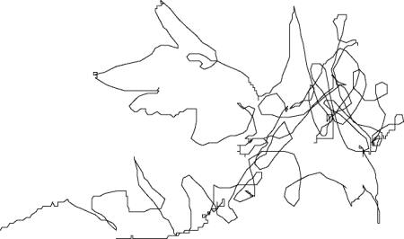 Végül egy kis ízelítő a „magasabb művészetből”. Az alábbi rajzot egy Boris névre hallgató angol juhászkutya (fajtájára nézve border collie) készítette, nyakában egy GPS-vevővel. A területet szabadon bejárva mit is rajzolhatott volna mást, mint épp egy kutyafejet...