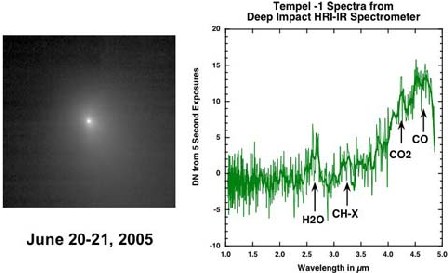 A Tempel-1 képe (baloldalt) a Deep Impact közepes felbontású kamerájával, valamint az infravörös
