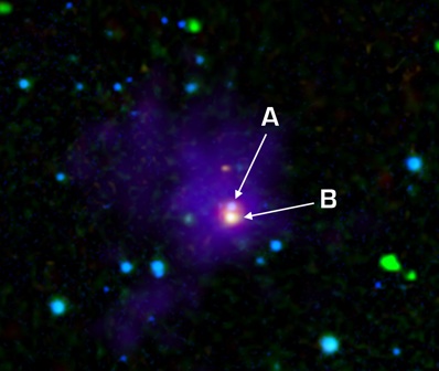 A bíbor-kék (A) és a narancs-fehér (B) objektumok feltételezhetően a legfiatalabb proto-barnatörpék, melyeket eddig felfedeztek. A „gyerekszobát” övező hideg por bíbor színnel jelölve látható. A fenti kép egy montázs, mely több kép felhasználásával készült. A képek: a Caral Alto-i obszervatóriumban készült közeli infravörös felvételek (1,3 és 2,2 μm-es hullámhosszakon, kék színnel jelölve), a Spitzer infravörös kamerájával készített képek (4,5 μm-es [zöld], és 8 μm-es [citromsárga] hullámhosszakon), a MIPS nevű Spitzer eszköz által végzett megfigyelések (24 μm-es hullámhossz, piros), és távoli infravörös megfigyelések a Caltech Szubmilliméteres Obszervatóriumból (350 μm, bíbor). (Kép: NASA / JPL-Caltech / Calar Alto Obs. /Caltech Submm. Obs.)