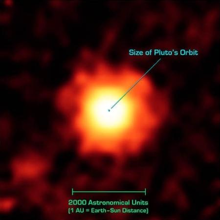 A felvétel 2009 januárjában készült 70 μm-es hullámhosszon. A HR 8799 igen távol, mintegy 129 fényévre van tőlünk, így az, hogy lefényképezzék a körülötte lévő korongot, rendkívül nagy kihívás volt. Hasonló felvételt már a Fomalhaut esetében is készítettek, ám az a rendszer (bolygók + törmelékkorong) ötször közelebb található. (Kép: NASA / JPL-Caltech / Univ. of Arizona)