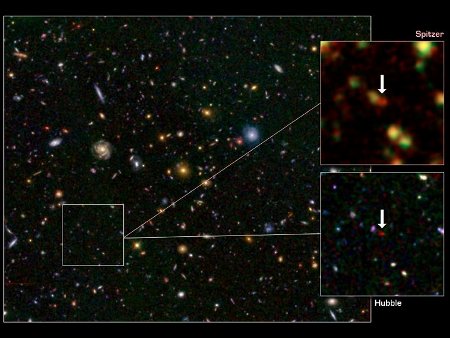 Az GN-108036 jelű, egyik legfiatalabb ismert galaxis a Spitzer- és a Hubble-űrtávcső felvételein. A ma észlelt fénye 12,9 milliárd évvel ezelőtt indult útnak, mintegy 750 millió évvel az Ősrobbanás után. A galaxis csak az infravörös tartományban észlelhető és vörös foltként jelenik meg az e tartományban érzékeny detektorok felvételein. (Kép: NASA / JPL-Caltech / STScI / University of Tokyo)