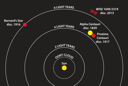 A WISE J104915.57-531906 valójában a Naptól mérve a harmadik legközelebbi csillagrendszer. A csúcstartó az α Centauri (valójában maga is egy kettős, tőlünk 4,4 fényévre) és távoli kísérője, a Proxima Centauri (4,2 fényév). Az előbbiről 1839-ben derítették ki, hogy a Nap csillagszomszédja, az utóbbit 1917-ben azonosították. A jelenlegi ismert második helyezett Barnard-csillag 6 fényéves távolságát 1916-ban mérték meg.