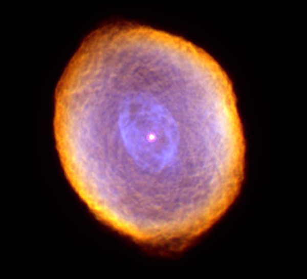 A planetáris ködök klasszikus példája a Lant (Lyra) csillagképben látható Gyűrűs-köd (M57 vagy NGC 6720). Távolsága 2300 fényév, az 1,3 fényév átmérőjű köd 18–19 km/s sebességgel tágul. Magyar vonatkozása, hogy a közepén látható fehér törpe csillagot, amelyik a köd gázanyagát egykor ledobta magáról, Gothard Jenőnek sikerült először lefényképeznie (1886-ban). A forró központi csillag erős ibolyántúli sugárzása gerjeszti világításra a ködöt. A színek kavalkádja annak köszönhető, hogy a különböző elemek más-más hullámhosszakon sugároznak, a képen kék területek a hélium, a tengerzöld a hidrogén és az oxigén, a külső gyűrűn a vörös a nyomokban előforduló nitrogén, a sötétebb narancssárga pedig a kén sugárzásából ered. Különösen érdekesek a sötétebb, általában sugárirányban álló, tüskeszerű foltok, ezek a környezetüknél valamivel sűrűbb gáztömegek, amelyek jobban ellenállnak a csillag erős sugárzásának. (Kép: NASA / ESA / The Hubble Heritage Team / STScI / AURA / ESA/Hubble Collaboration)