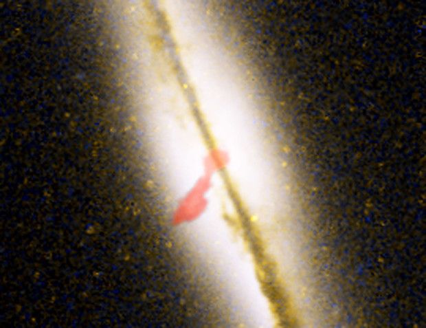 A Hubble felvételén nem, de az amerikai VLA (Very Large Array) rádióteleszkóp-hálózattal készített képen látható a rádiójet. Ezt egy korábbi Hubble-képpel kombinálták, piros színnnel ábrázolva. (Kép: NASA / ESA / NRAO/AUI/NSF / W. Keel, Univ. of Alabama, Tuscaloosa)