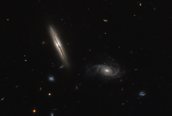 A LO95 0313-192 jelű, éléről látszó spirálgalaxis a Hubble képén, balra. (Kép: ESA / NASA / Judy Schmidt)
