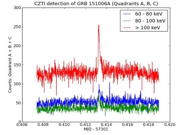 Az Astrosat egyik első észlelése: a GRB 151006A gamma-villanást a 100 keV fölötti energiatartományban mutatta ki a CZTI (kadmium-cink-tellur képalkotó) műszer. Kapcsolódó cikkek: Kapcsolódó linkek: