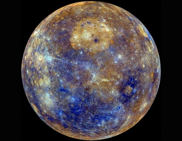 A Merkúr felerősített színes képe. A bolygókorong felső középső részén látható világos, kerek folt hatalmas kiterjedésű lávakiömlés, amelyik a bolygó legnagyobb becsapódásos kráterét, a Caloris-medencét tölti ki. (Kép: NASA / JHU APL / CIW)
