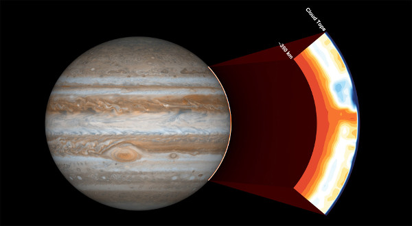 A Juno mikrohullámú sugárzásmérője a felhőtakaró teteje alatti réteget mintegy 350 km mélységig tudja felderíteni. (Kép: NASA / JPL-Caltech / SwRI)