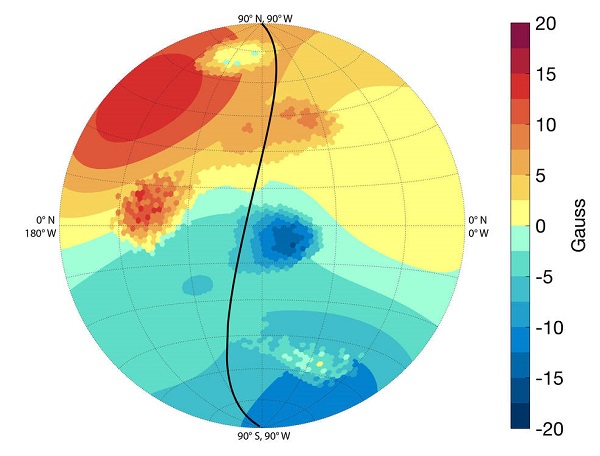 A Jupiter mágneses tere, a fekete vonal az űrszonda elhaladásának vetülete. (A Föld mágneses terének erőssége a felszínen helytől függően néhány tized gauss.) (Kép: NASA / MSSS / SwRI / Caltech)