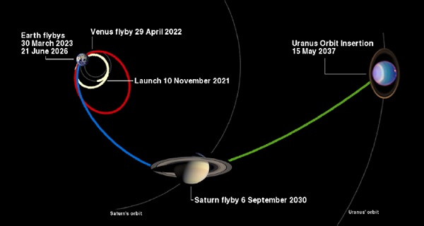 Egy lehetséges, az Uránusz felé vezető pálya. (Kép: NASA / CSA)