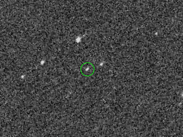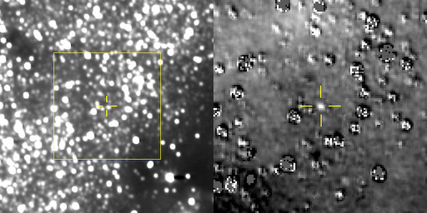 Több mint három évvel a Plútó melletti, űrtörténelmi elrepülése után, augusztus 16-án a New Horizons LORRI (Long Range Reconnaissance Imager) kamerájával 48 különböző, közel fél perces expozíciót készítettek a célpontról, amelynek előre számított pozícióját a bal oldali képen a sárga négyzet jelöli. A jobb oldali képen ez a tartomány látható kinagyítva, ahol a fényes háttércsillagok levonása után előtűnik az Ultima Thule. A kép szintén űrtörténelminek mondható: ez eddig űrszonda által a Földtől legnagyobb távolságban készített felvétel. Természetesen ezt a rekordot a New Horizons szondával még sokszor meg szeretnék dönteni! (Kép: NASA / Johns Hopkins University Applied Physics Laboratory / Southwest Research Institute)