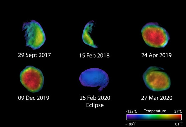 A Phobos hőmérsékletét a hold különböző fázisaiban mutató infravörös–optikai kombinációjú felvételek. (Kép: NASA / JPL-Caltech / ASU / NAU)