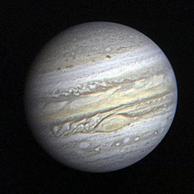 A Voyager–1 szonda 1979. január 9-én készítette ezt a képet a Jupiterről, Bár a szonda akkor még 54 millió km távolságban volt a bolygótól, a felvételen a Földről soha nem látható részletek is feltűntek. (Kép: NASA / JPL)