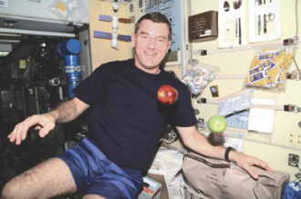 James Voss (ISS, 2. személyzet) válogat az almák közt az űrállomás Zvezda moduljában. (Kép: NASA)