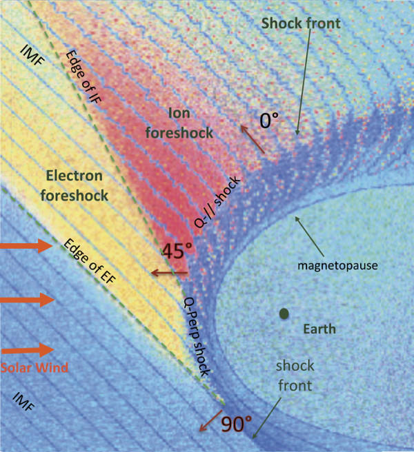 A földi magnetoszféra külső határát jelentő fejhullám és a kapcsolódó külső plazmarégiók szerkezetének és elhelyezkedésének vázlatos képe. Ez a terület számos érdekes és bonyolult fizikai folyamat helyszíne. (Forrás: Tsurutani & Rodriguez 1981; Hui Zhang et al. 2022)